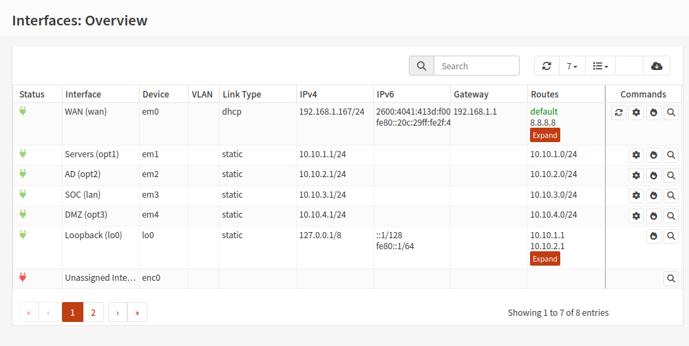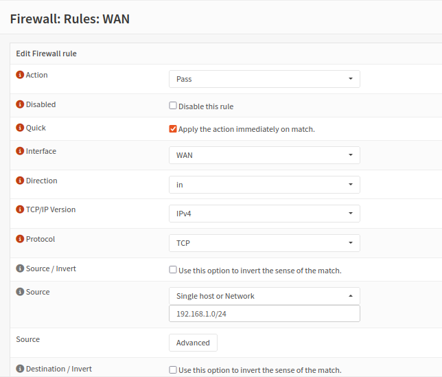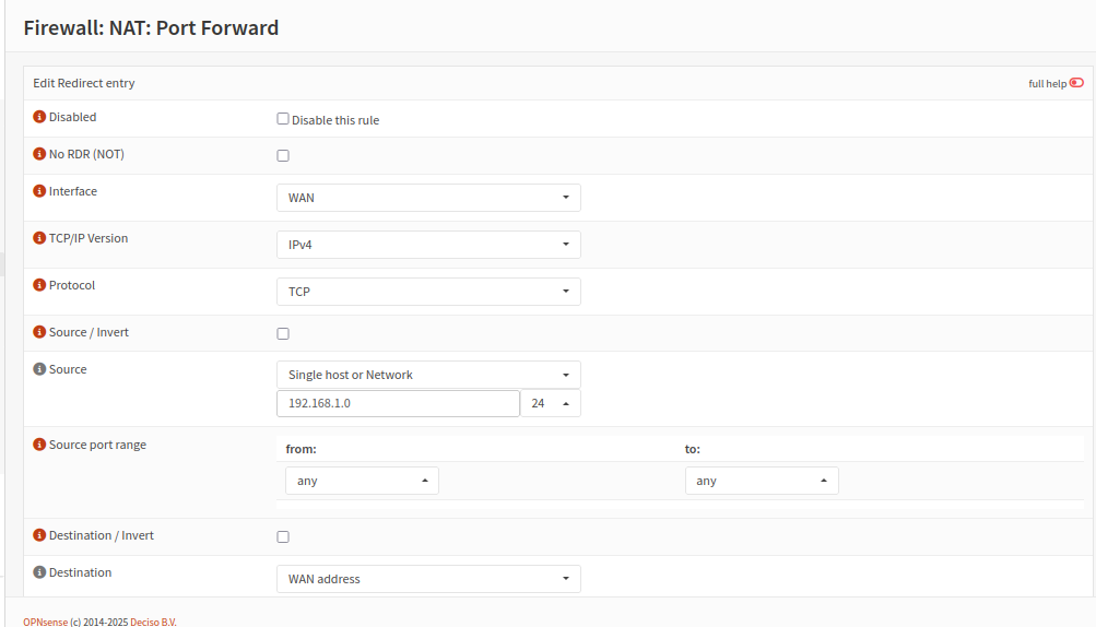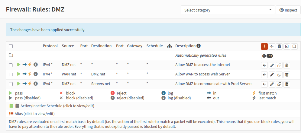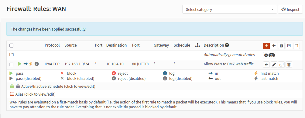 - WAN net → DMZ net (my home network will be able to reach the DMZ via port forwarding, this will be configured later)