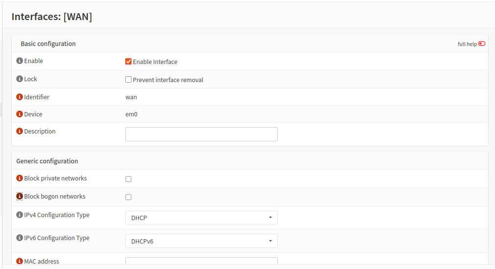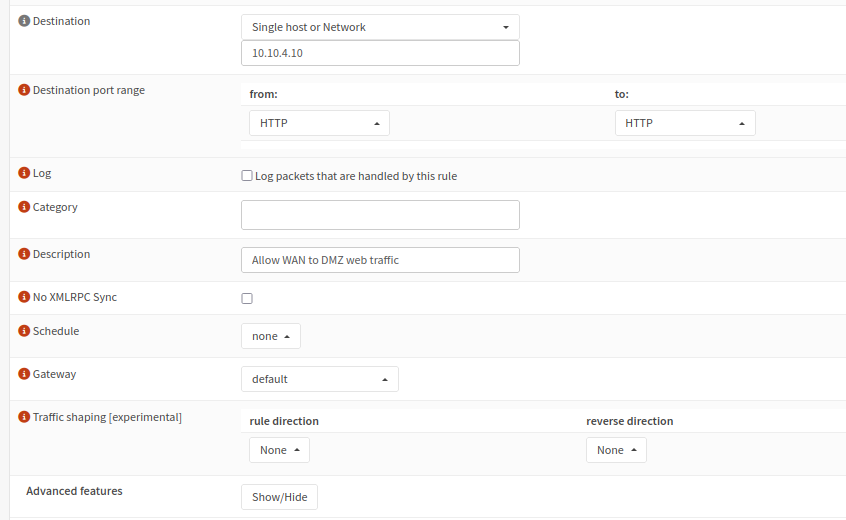 Under generic configuration, uncheck Block private networks and Block bogon networks. 192.168.1.0/24 is indeed a private address range, however in my lab setup, we consider it an external network (from the internal VMs’ perspective). We will need to uncheck this setting in order for devices on the home network to actually be able to reach the web server. Otherwise, all traffic originating from 192.168.1.0/24 will be blocked, no matter what firewall rules we have in place.