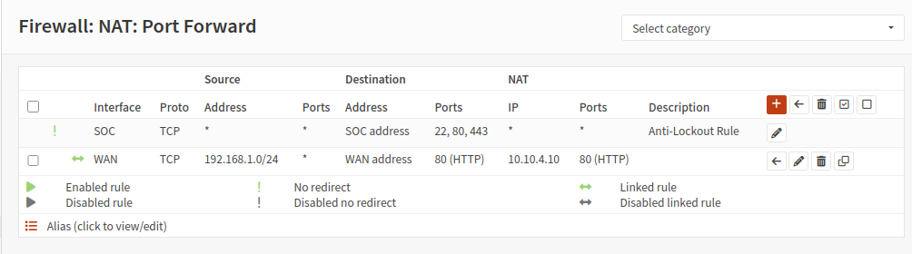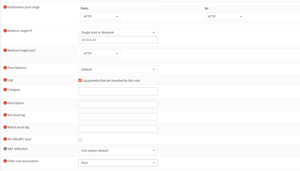Keep in mind that devices on the home network can communicate with the OPNsense VM solely because it is placed on the same network (192.168.1.0/24). Hosts on the home network cannot directly reach the WebServer using its IP address 10.10.4.10, so we must redirect the traffic from OPNsense to the WebServer via port forwarding.