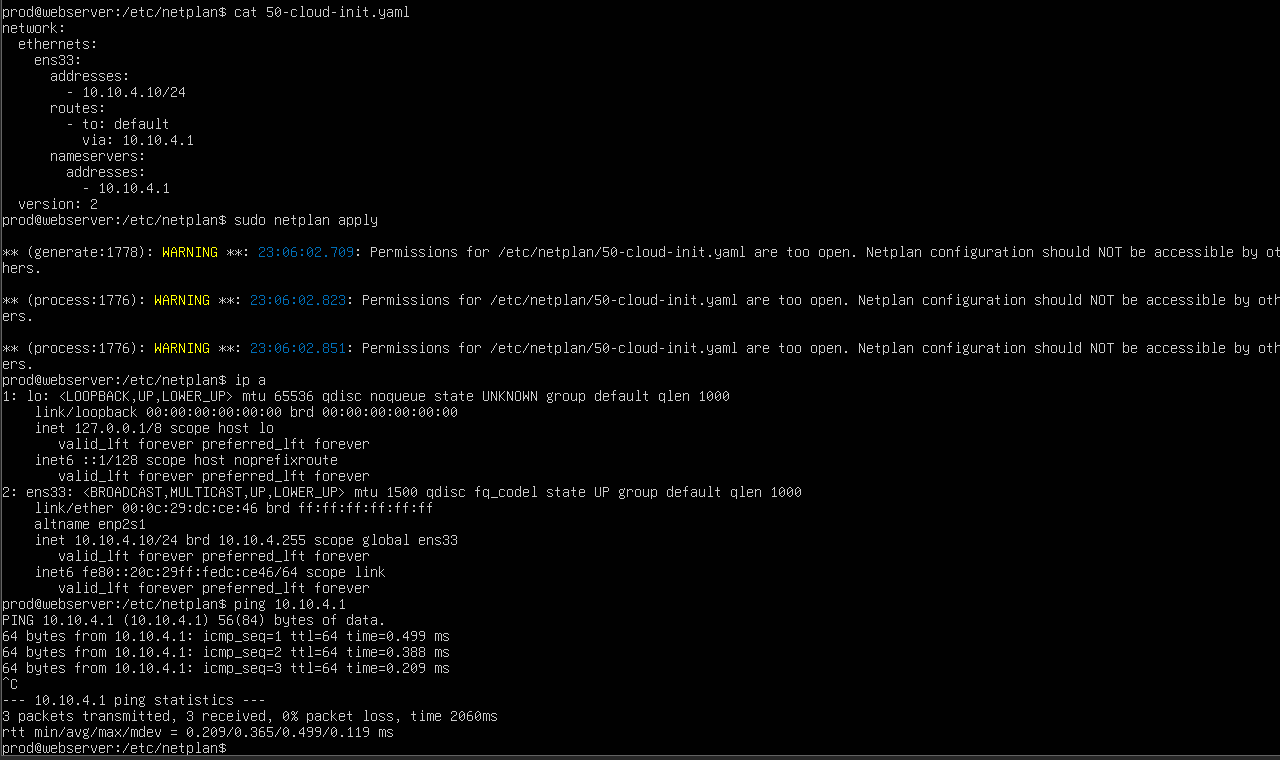 Follow this YAML format for the network configuration. I gave this VM the IP address 10.10.4.10. Run some ping tests to make sure connectivity works.